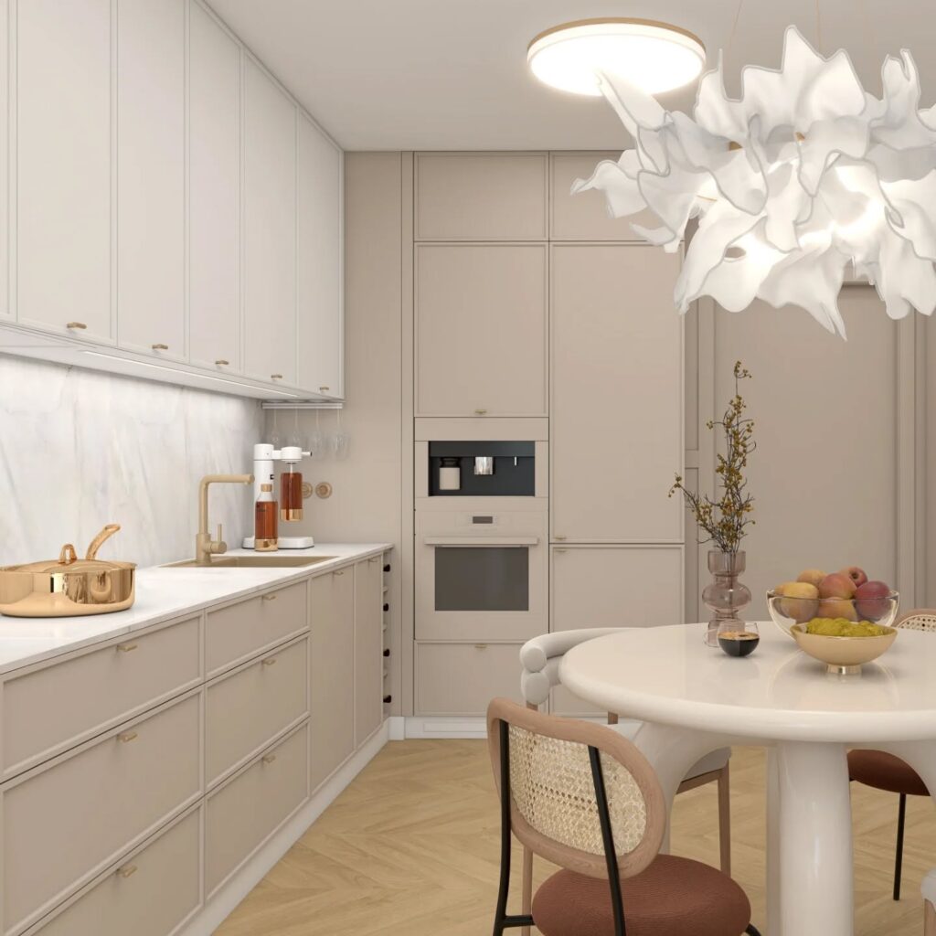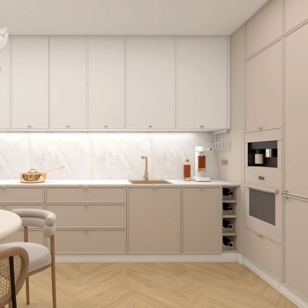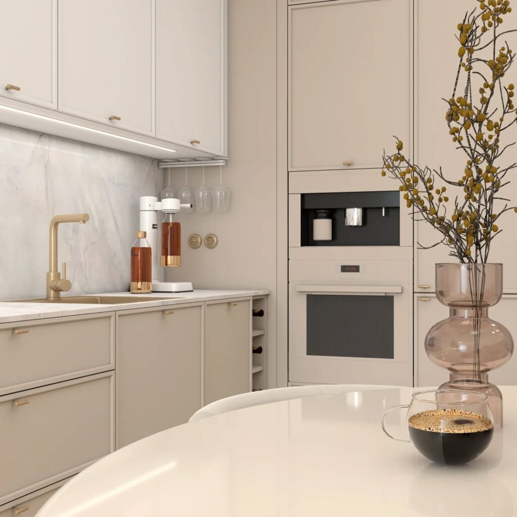 Kuchnia w stylistyce Contemporary Elegance, która została precyzyjnie dopracowana w detalach, tworząc przestrzeń pełną elegancji i codziennego komfortu.