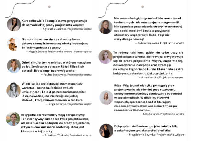 Na stronie Bootcampu znajdziesz opinie absolwentów, ich projekty i profile zawodowe. To prawdziwi ludzie, którzy po ukończeniu kursu rozpoczęli karierę w branży projektowania wnętrz.