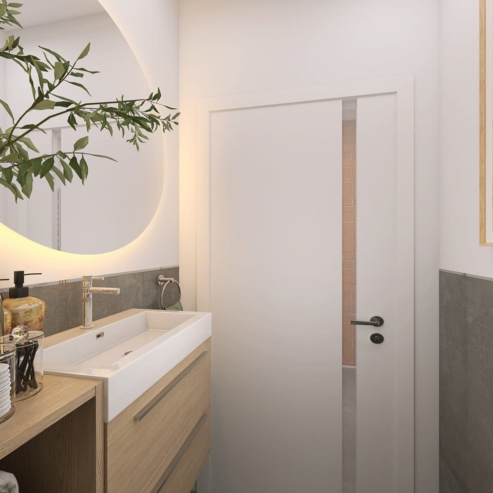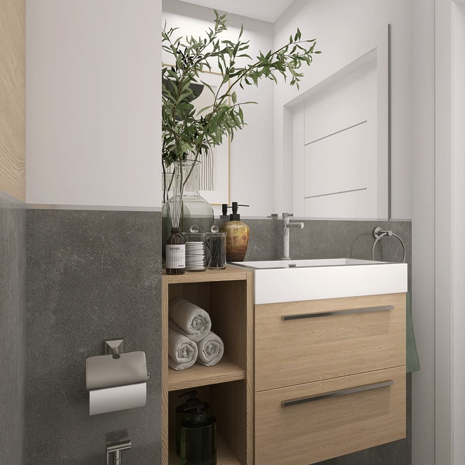 Zwróćcie też uwagę na szafkę z umywalką. Pod nią jest sporo wolnej przestrzeni nie bez przyczyny. 😇Zostało tam zaplanowane awaryjne miejsce na kuwetę dla kota, gdyby jednak puchatemu członkowi rodziny nie przypadła do gustu lokalizacja kuwety w górnej łazience.